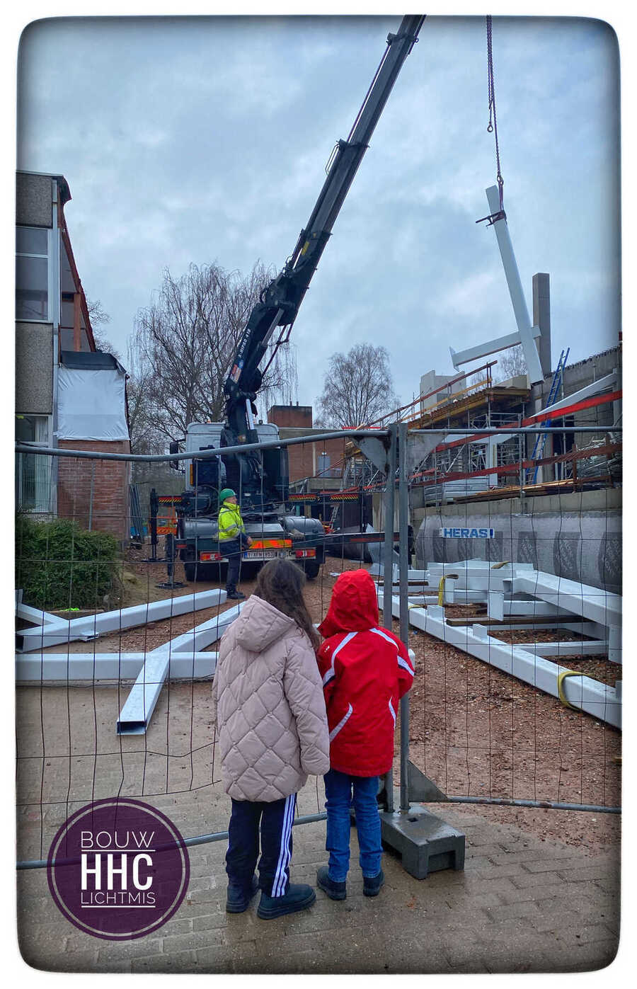 Maar de werken werden na de vakantie hervat en het gaat louter opwaarts. Week na week zien wij het gebouw hoger rijzen. De contouren worden almaar duidelijker. De liftkoker tekent zich scherp af tegen de hemel en de trappen werden met een machtige kraan op hun plaats gehesen. Dit was een schouwspel dat menig paar kinderogen deed glinsteren. Vanop de speelplaats van de lagere school wordt de werf met grote belangstelling gadegeslagen. Nieuwsgierige kindjes volgen elke beweging.