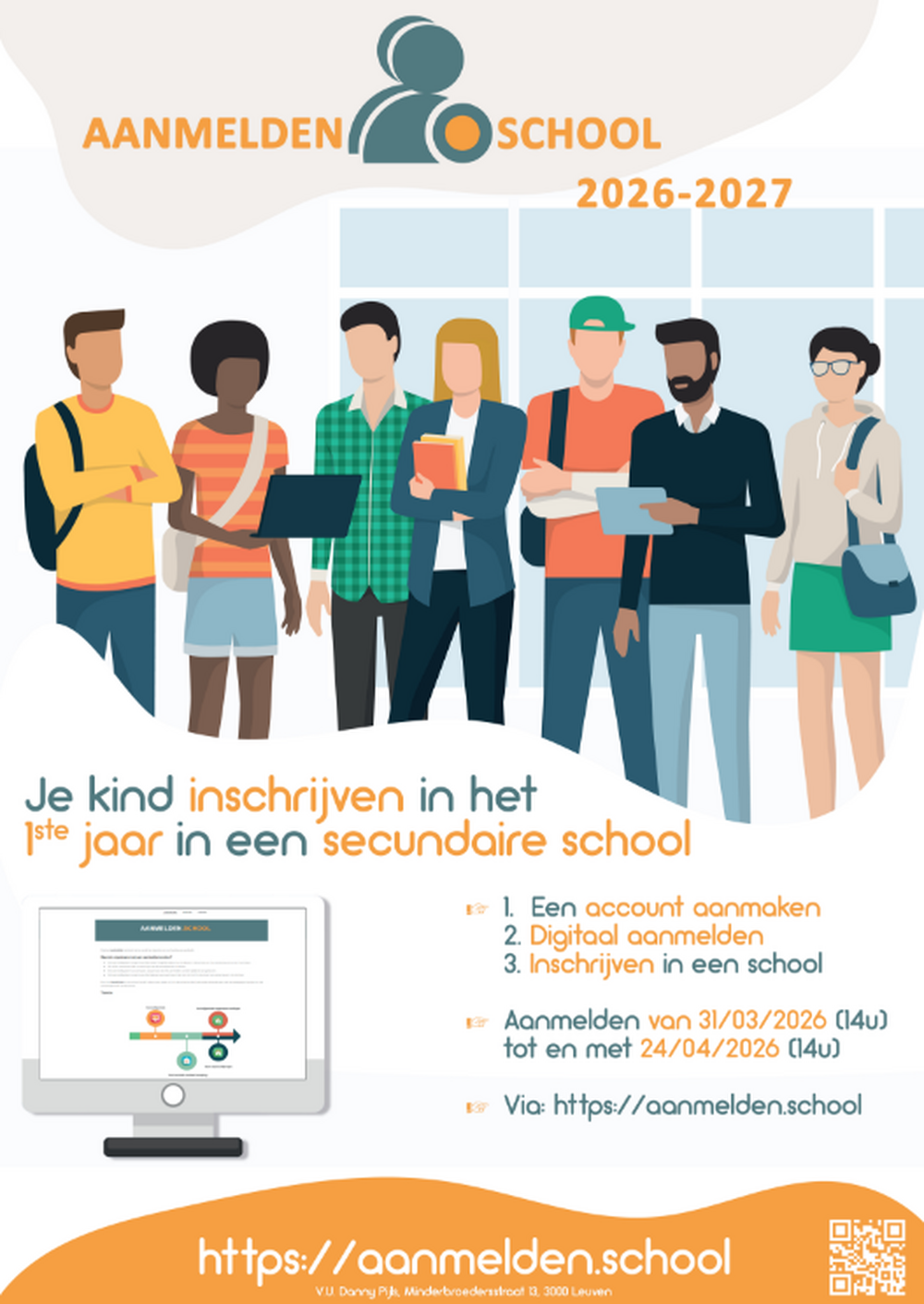 Samen met meer dan 100 scholen in de ruime regio organiseren wij de inschrijvingen voor het eerste jaar via een het digitaal aanmeldplatform. U vindt alle info op aanmelden.school